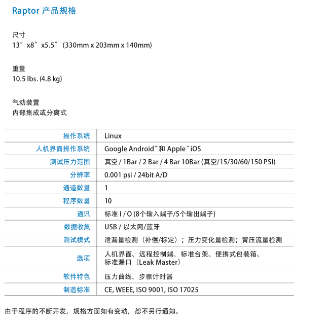 Raptor系列測試儀在壓力變化模式、補償/校準模式或背壓流量下均可測試。Raptor的10個測試程序可讓您在面對不同的部件類型、型號和配置時都能游刃有余。